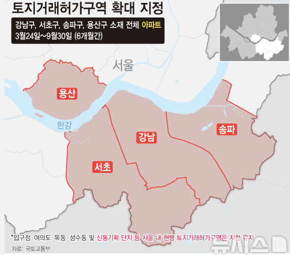 서울시는 강남 3구(서초·강남·송파)와 용산구 전역을 다시 토지거래허가구역으로 지정했다. 이 조치가 시행되자, 아파트값의 상승 폭이 급격히 둔화되었다.
