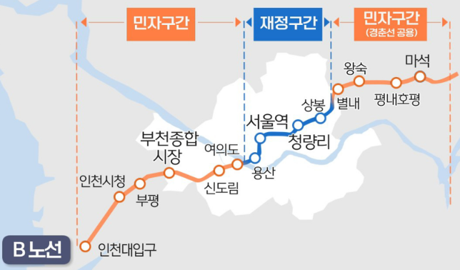 | 추진 방식 | 재정구간(용산~상봉) + 민자구간(인천대입구~용산, 상봉~마석) |